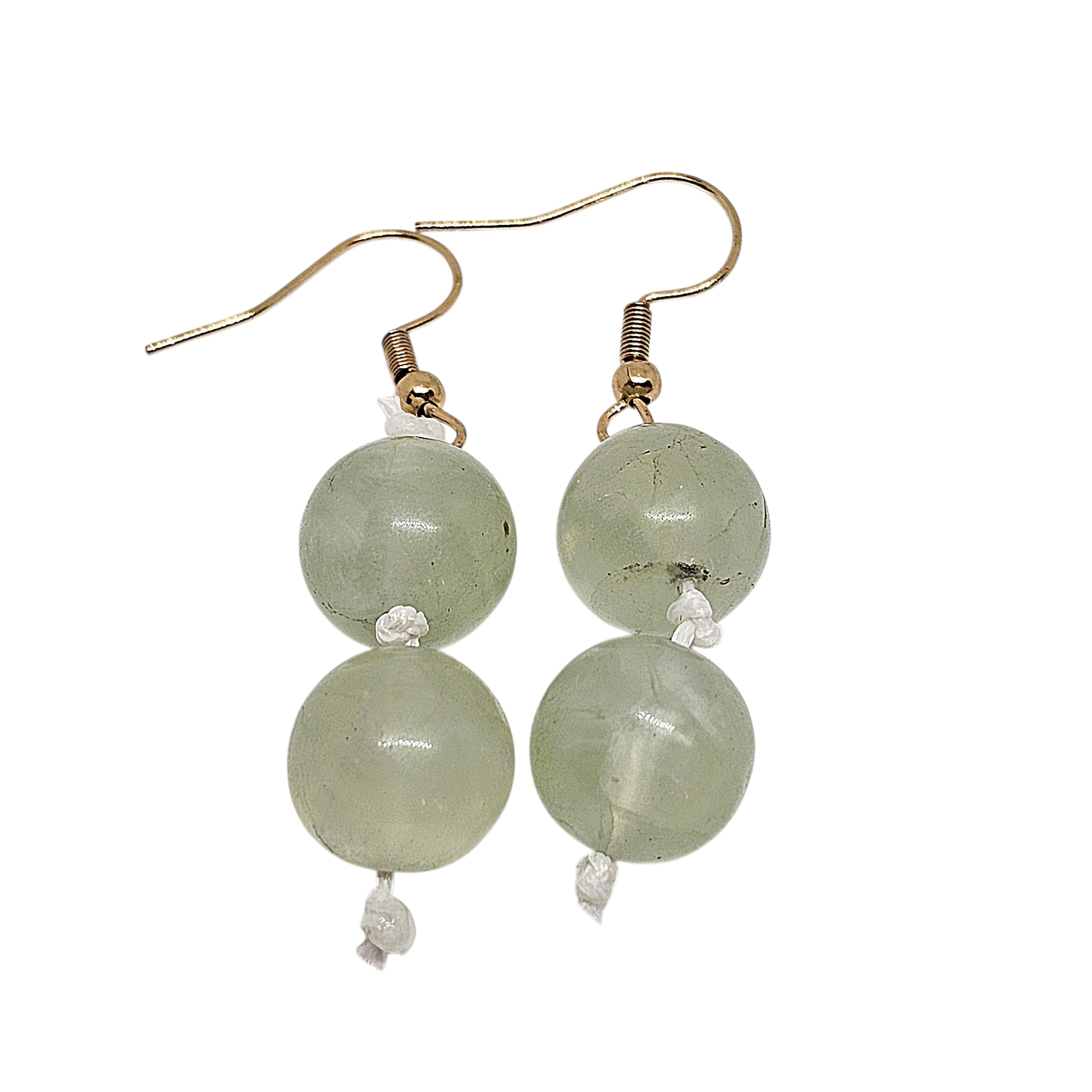 Diese wunderschönen Prehnit-Ohrringe bestechen durch ihre zartgrüne Farbe und den sanften Glanz der sorgfältig polierten Kugeln.