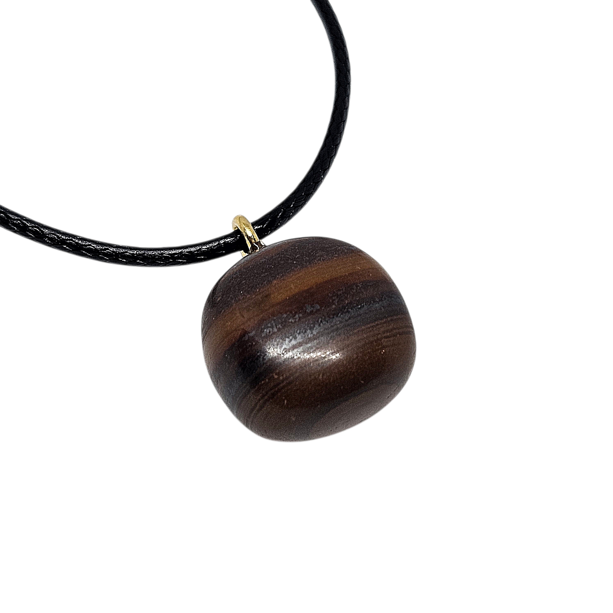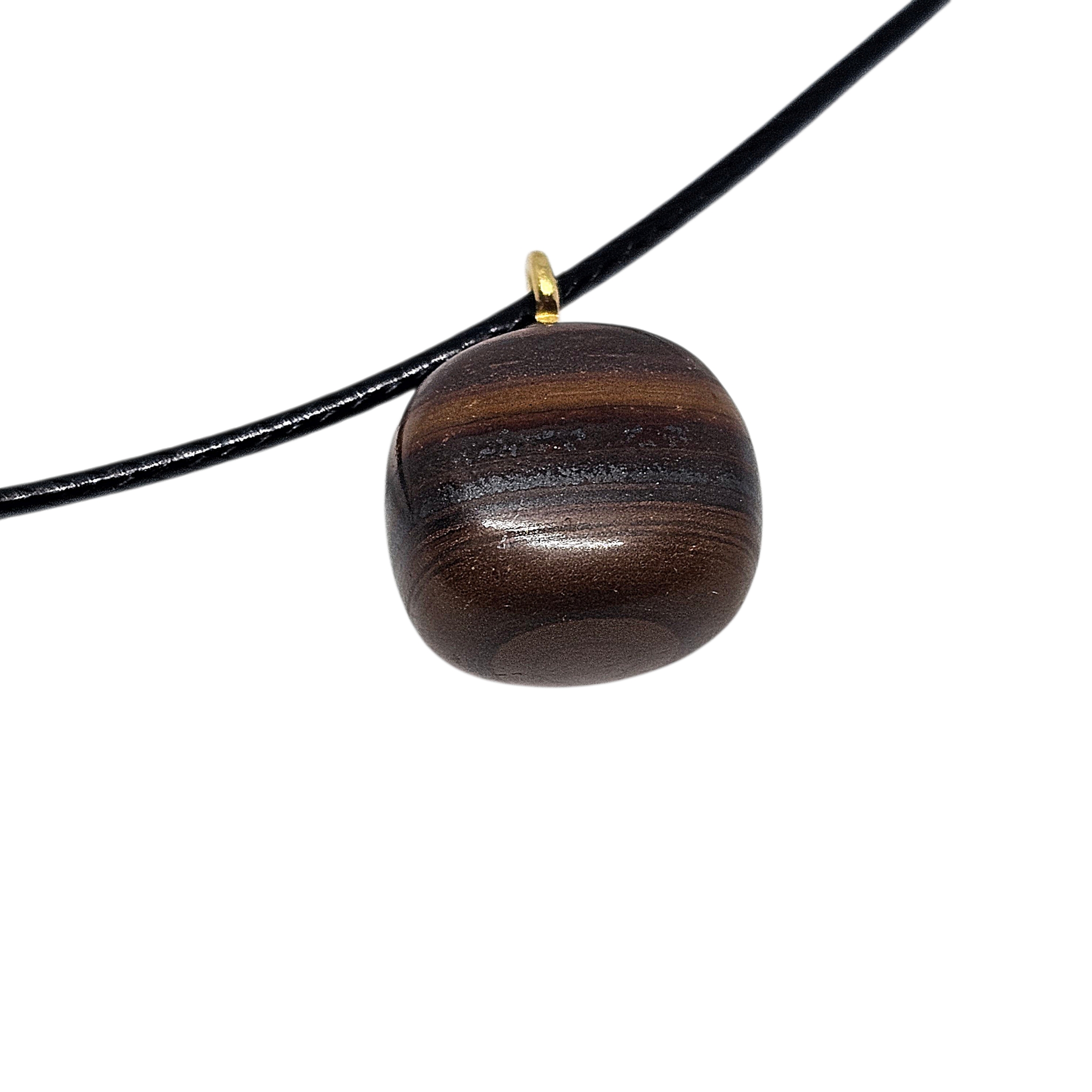 Dieser Tigereisen Anhänger besticht durch seine markante Struktur aus schimmernden Gold-, Rot- und Dunkeltönen. Die natürliche Kombination verschiedener Mineralien verleiht dem Stein eine ausdrucksstarke und einzigartige Optik, wodurch jedes Stück zu einem echten Unikat wird.